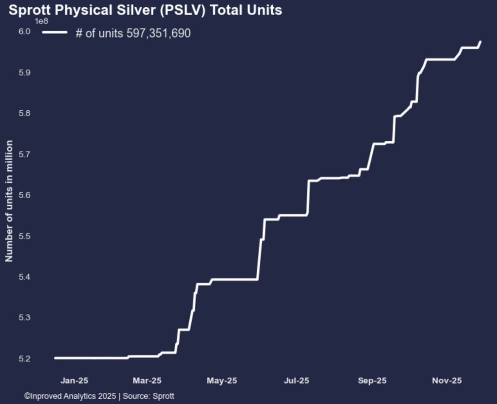 Start with the vote you can count. Sprott Physical Silver Trust’s register grew by 1,470,800 units to 597,351,690 on Friday. That is not a meme; it is metal. PSLV is a fully allocated structure, so unit growth maps to bars under custody. When investors add to a trust that cannot issue paper unbacked by inventory, they aren’t chasing optionality—they are locking supply. Moves like this don’t set intraday highs. They build the floor underneath them.