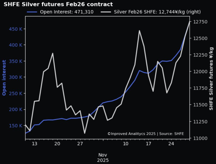 Now pan to Shanghai, where the market’s plumbing has been doing most of the talking. “CME is down but silver is roaring in China,” as traders like to say on days when time zones disagree. On the SHFE, silver closed up about 3.3% at roughly $56/oz on the Feb ’26 contract, while open interest jumped 10.6% week-to-date to 789,444 contracts. Participation is not a concept there; it’s a number. And it keeps rising.