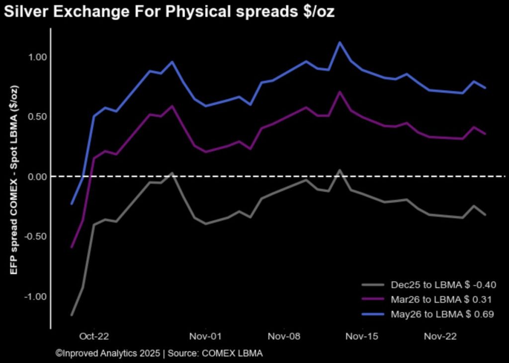 That is exactly what you are watching now: two regions, two curves, one message. The SHFE confirms it with widening negative spreads across spring and summer ’26. The COMEX confirms it with Dec ’25 cheap to spot. And the basis confirms it with China consistently bid above London. When three microphones pick up the same frequency, it isn’t a rumor. It’s a note.