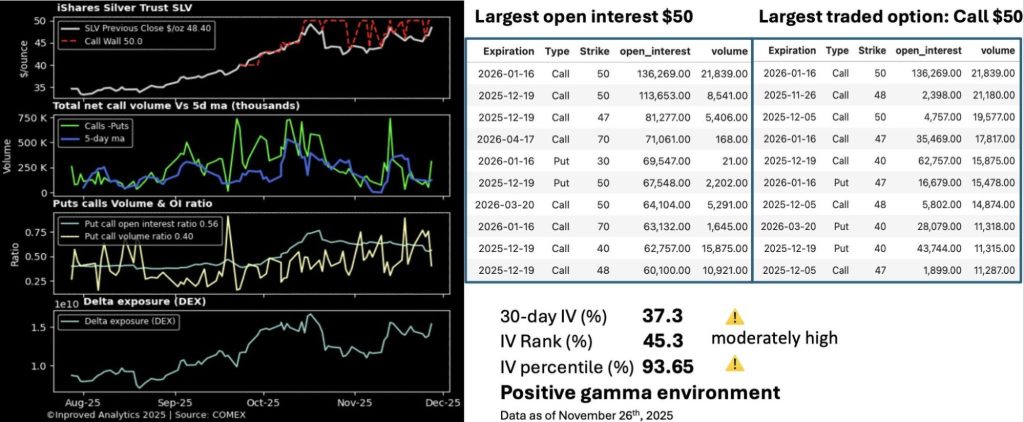 If you want the Western mirror of that behavior in options form, look at the largest US silver ETF. SLV’s call wall has crept toward the $50 strike, with traders racking up calls and the put-call open interest ratio sliding as upside appetite outpaces hedging demand. In other words, the equity-listed wrapper for silver exposure is trading like investors want convexity to the upside, not protection from downside. That doesn’t determine the destination, but it does tell you how the crowd is positioned to travel.