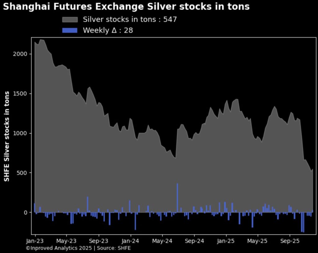 That pipe is the vault ledger. After months of relentless drain, Shanghai silver inventories finally notched a modest inflow of 28 tons week-to-date, lifting stocks to around 547 tons. The context matters more than the uptick: those warehouses had been decimated by roughly 61% (–793 tons) over four months. From that base, +28 tons doesn’t fix anything; it just proves that bars can still be coaxed into the city when prices and timing cooperate. Think of it as a catch-breath, not a trend. The market clearly did—because while those ounces were arriving, the SHFE curve backwardation widened, not narrowed, and the premium to London persisted.
