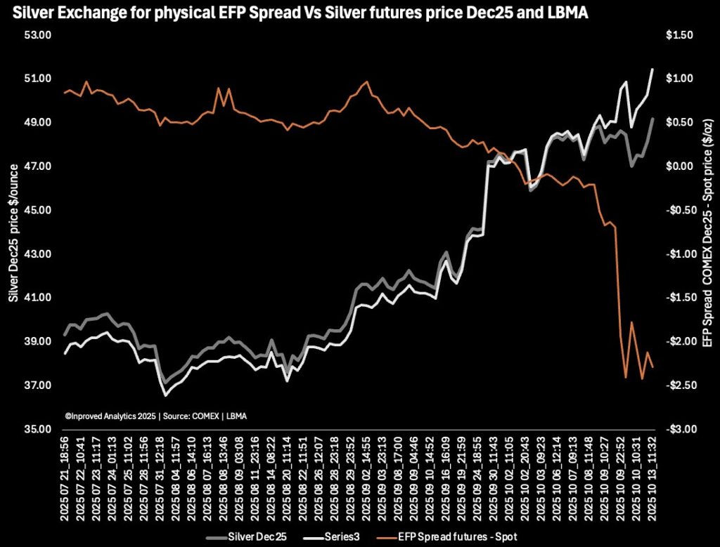 For the first time in two and a half years, silver in China is trading at a discount to LBMA spot, while in New York, the futures curve has collapsed into deep backwardation — a full -$2.80 per ounce between spot and the December 2025 contract. In plain language: the world’s paper silver is now cheaper than the metal itself, and that’s turning every ounce into a prize worth fighting for.