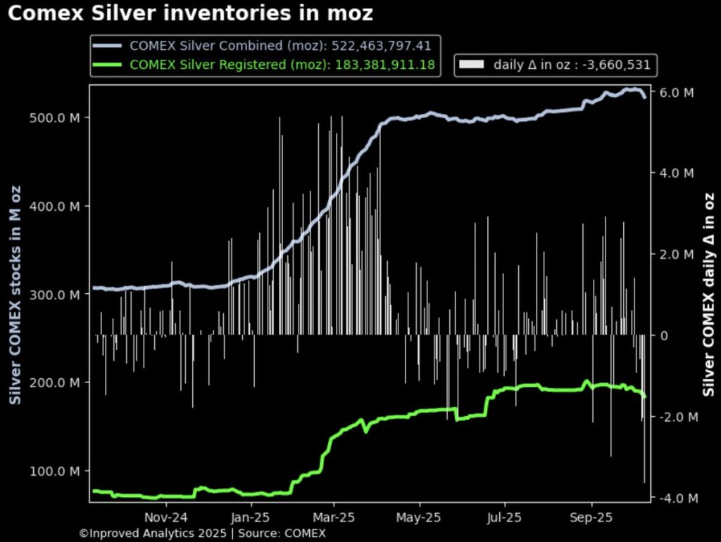 Each arbitrage requires actual metal to leave vaults. That’s why COMEX inventories have fallen 8.5 million ounces in five days, on top of a 5.75 million-ounce drawdown the week prior. As bars are shipped to meet delivery or collateral needs, available stock dwindles, and the curve steepens further.