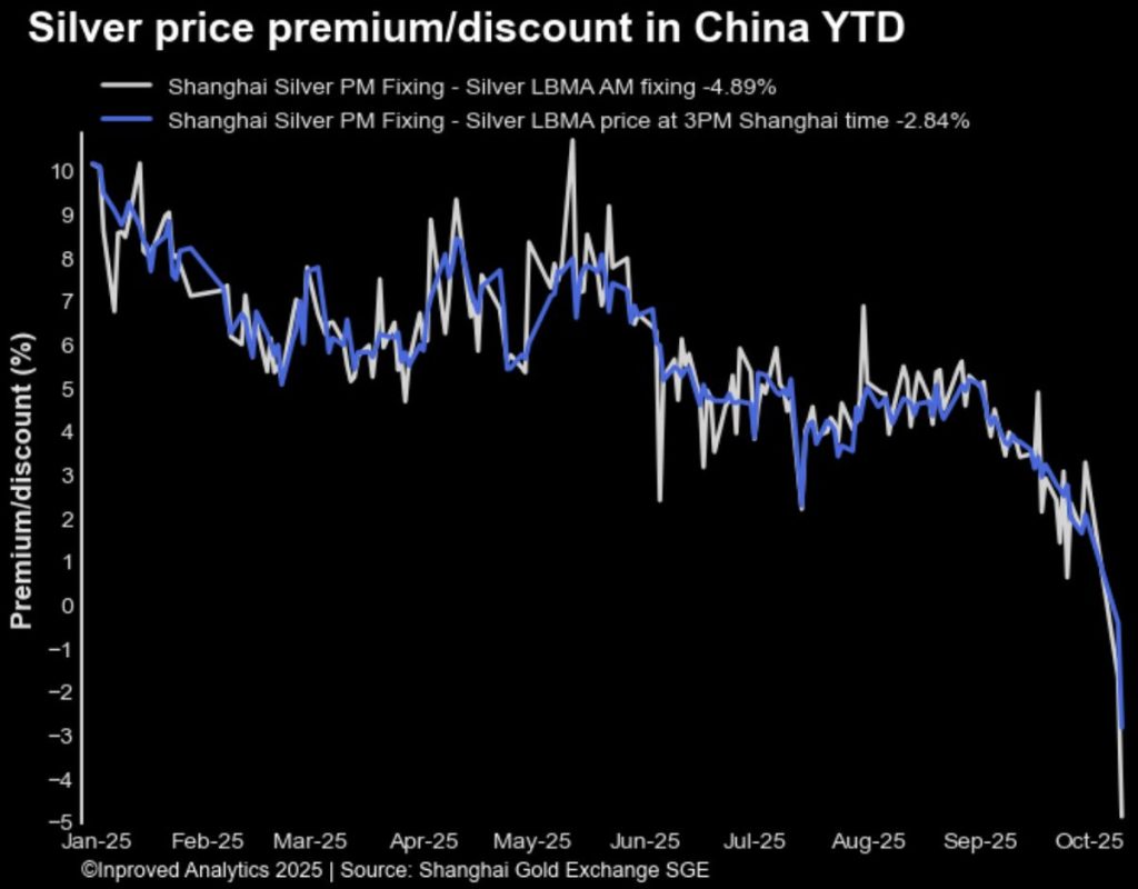 Perhaps the most telling signal of all: for the first time since 2023, Chinese silver is trading at a discount to LBMA, roughly -$0.21 per ounce (-0.43%).