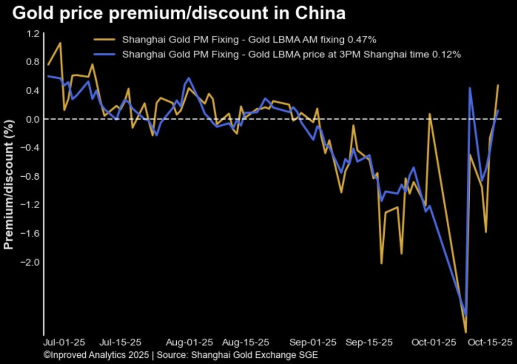 After several weeks of muted activity and mild discounts, Chinese gold premiums have turned decisively positive — trading between +0.12% and +0.47% above the LBMA benchmark.