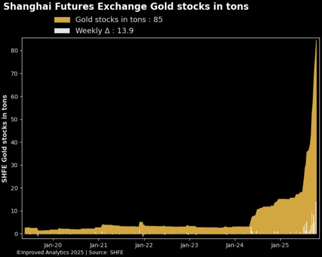 Last week, the city’s gold inventories surged 13.9 tons week-to-date to 84.6 tons (2.7 million ounces) — the largest inflow ever recorded. On Friday alone, 3.65 tons flowed into the system.