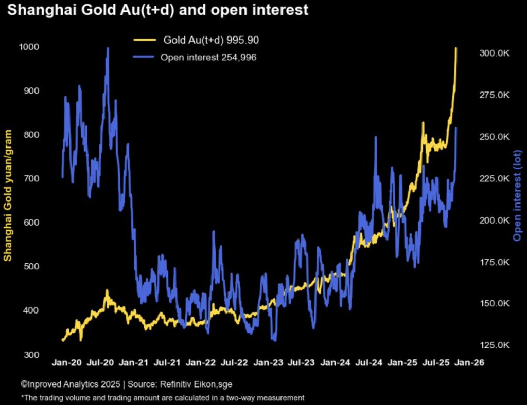 On the derivatives side, gold open interest (OI) on the SGE has soared to 255,000 contracts, matching levels last seen during the pandemic-era liquidity panic. Back then, it marked a turning point — when financial repression and inflation hedging collided to propel gold toward $2,000.