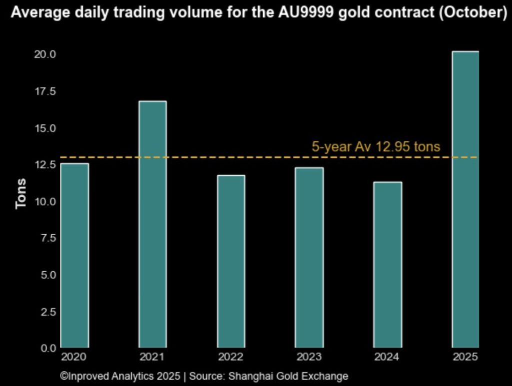 The physical proxy contract AU9999 has seen a daily average trading volume of 20.18 tons in October — a staggering 55% above its five-year average.